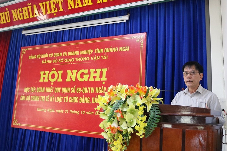 Thực hiện Kế hoạch số 85-KH/ĐUK ngày 31/8/2022 của Ban Thường vụ Đảng ủy Khối Cơ quan và Doanh nghiệp tỉnh và Kế hoạch số 181-KH/ĐU ngày 23/9/2022 của Đảng ủy Sở Giao thông vận tải về tổ chức nghiên cứu, quán triệt và triển khai thực hiện Quy định số 69-QĐ/TW ngày 06/7/2022 của Bộ Chính trị về kỷ luật tổ chức đảng, đảng viên vi phạm (Quy định 69), chiều ngày 31/10/2022, tại Hội trường Sở Giao thông vận tải, Đảng ủy Sở Giao thông vận tải tổ chức Hội nghị học tập, quán triệt Quy định 69. Về tham dự Hội nghị có đồng chí Nguyễn Anh Dũng, Ủy viên Ban Thường vụ, Trưởng ban Tuyên giáo Đảng ủy Khối Cơ quan và Doanh nghiệp tỉnh; các đồng chí trong Ban Chấp hành Đảng bộ Sở, Bí thư, Phó Bí thư các chi bộ trực thuộc cùng toàn thể đảng viên thuộc Đảng bộ Sở. Tại Hội nghị, đồng chí Nguyễn Anh Dũng, Ủy viên BTV, Trưởng ban Tuyên giáo Đảng ủy Khối Cơ quan và Doanh nghiệp tỉnh, báo cáo viên hội nghị đã trực tiếp giới thiệu các nội dung của Quy định 69, gồm: 4 chương, 58 điều, trong đó tập trung phân tích những điểm mới của Quy định 69 so với Quy định số 102 ngày 15/11/2017 và Quy định số 07 ngày 28/8/2018 của Bộ Chính trị về kỷ luật tổ chức đảng, đảng viên vi phạm. Cụ thể, các điểm mới trong Quy định 69 tập trung ở 3 nội dung: Quy định các hành vi mới trên cơ sở tổng kết thực tiễn và dự báo về các vi phạm trong thời gian tới; điều chỉnh tăng nặng hoặc giảm nhẹ chế tài đối với các vi phạm được quy định trước đây; xác định rõ động cơ, mục đích, hậu quả của vi phạm làm căn cứ áp dụng chế tài phù hợp và đồng bộ với quy định mới của Đảng và pháp luật Nhà nước, với mục đích để tổ chức đảng, đảng viên không muốn và không dám vi phạm kỷ luật của Đảng.